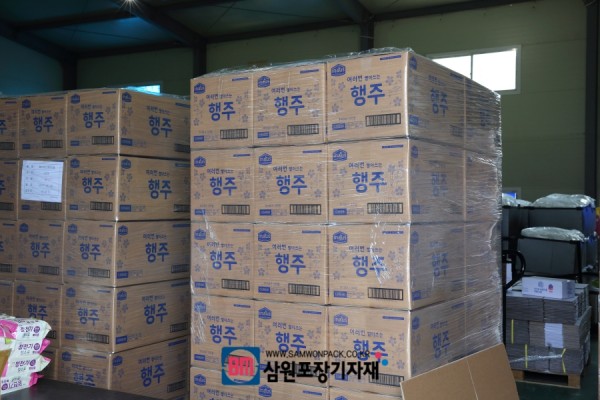 랩핑을 한 박스들.. 현재는 핸드랩핑기로 박스랩핑을 하셨는데 추후 자바라와 자동랩핑기(파렛트랩핑기)를 사용하시는걸 추천드렸답니다.