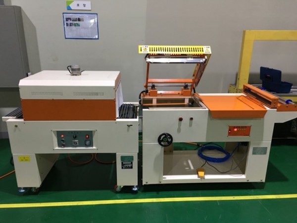 반자동 수축포장기는 L-Sealer (엘실러,오른쪽)와 수축터널(왼쪽)로 이뤄져 있으며 주문하시는 업체에 맞춰 기능을 변경 추가할수 있습니다.