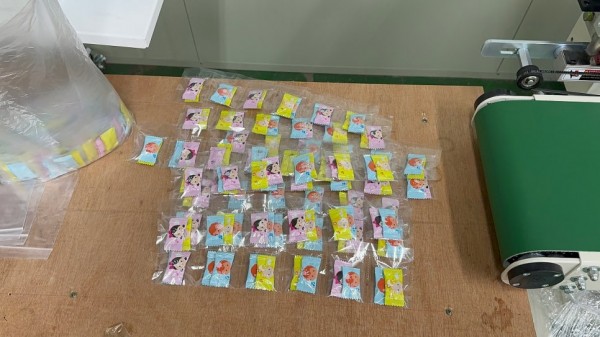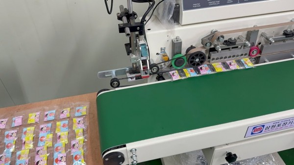 여러개의 캔디가 연결된 비닐파우치를 실링하는 작업으로 크기가 다양한 비닐파우치 실링 작업이 연속으로 가능합니다.