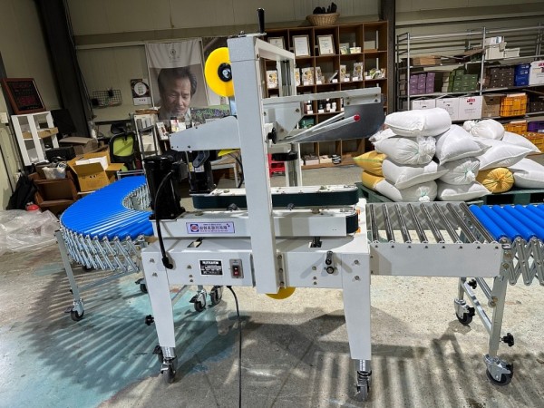 하부제함&하부테이핑기로 완성된 박스는 반자동테이핑기로 이동하여 상부 테이핑 작업을 받습니다.