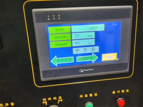 한글을 지원하는 터치패널 콘트롤러로 필름의 길이조절과 생산속도를 설정할수 있으며, 인쇄필름 무지필름 등의 감지를 위해 아이마크 센서가 달려있습니다~
