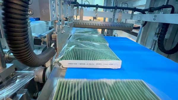 기존에 아다치컨베이어를 사용하는 삼면포장기로 비닐포장하던 필터, 에어필터 비닐포장을 이렇게 고속으로 빠르게 작업이 가능하며