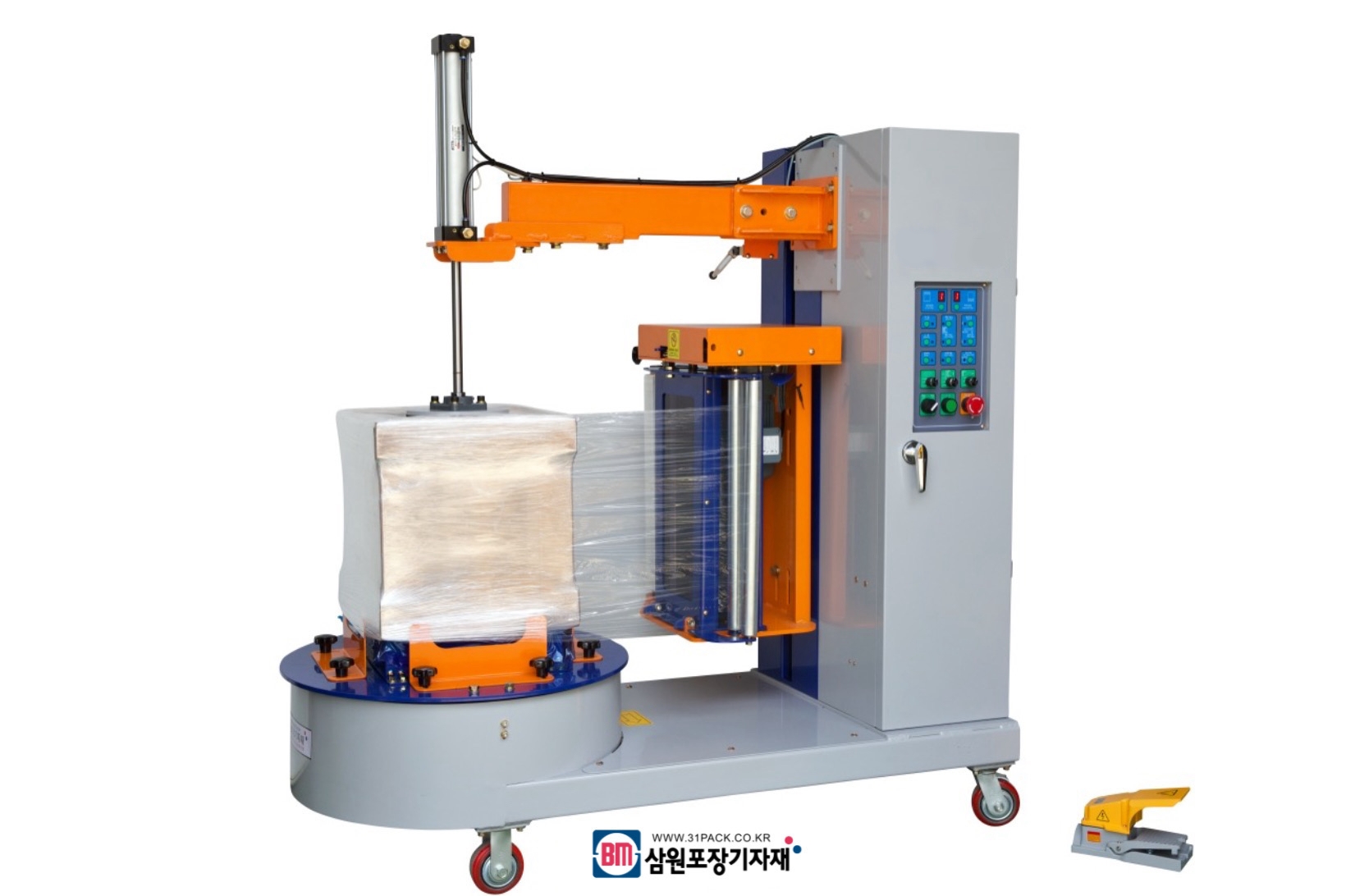 턴테이블 위에 박스제품을 올려놓으면 상부 프레스가 박스를 고정하고 랩포장을 진행하며, 셋팅한 횟수만큼 자동으로 회전해 랩핑 할 수 있으며 풋스위치로 작동도 가능합니다.