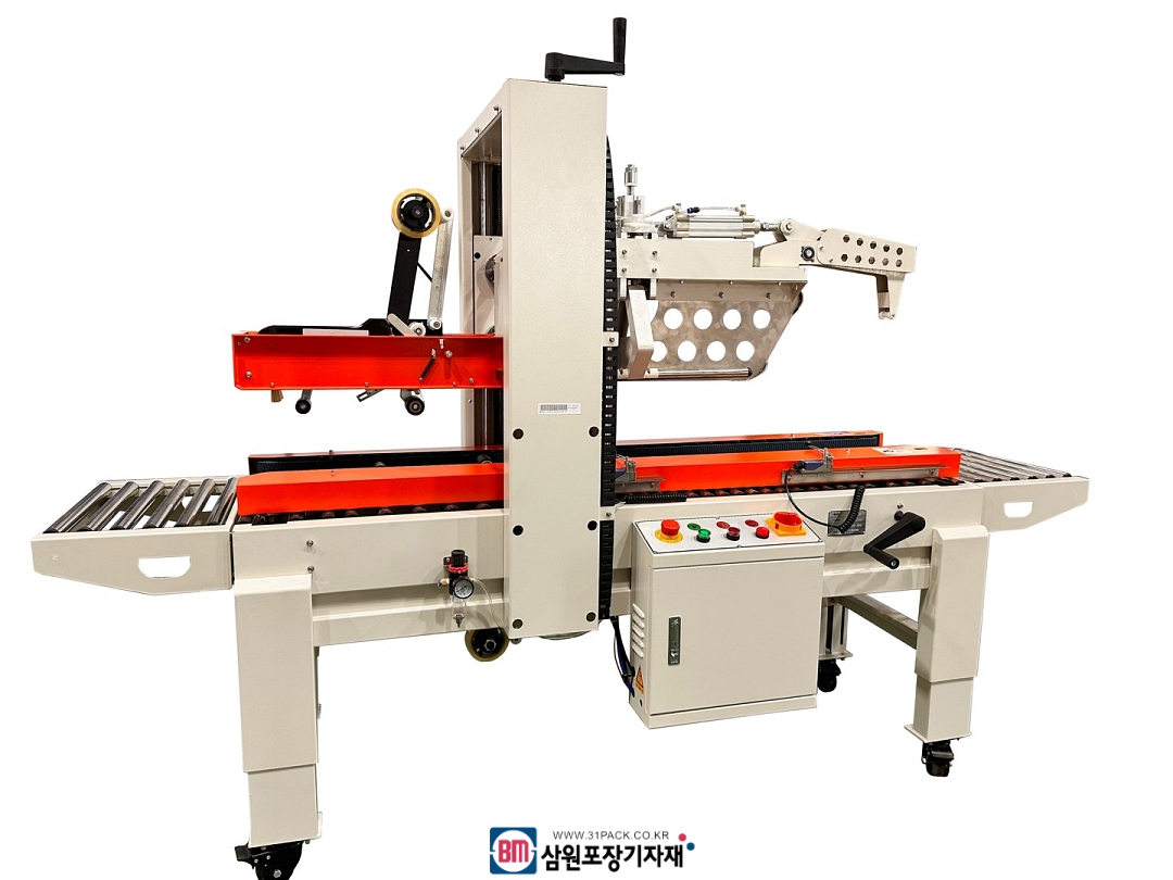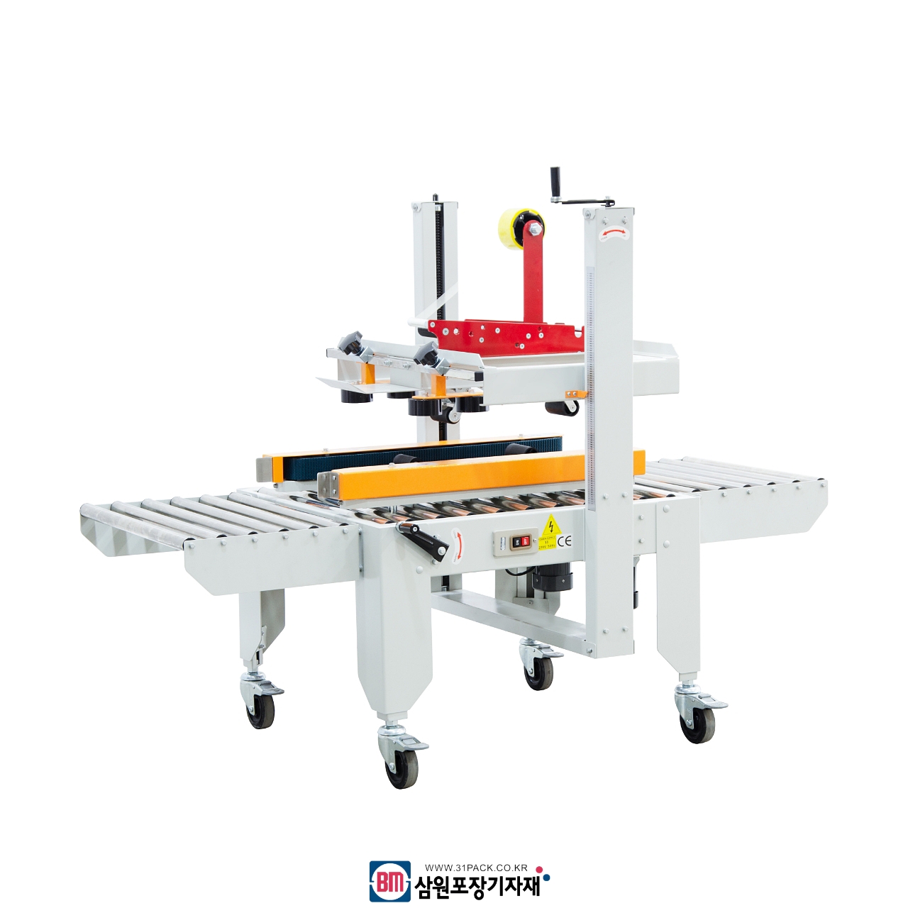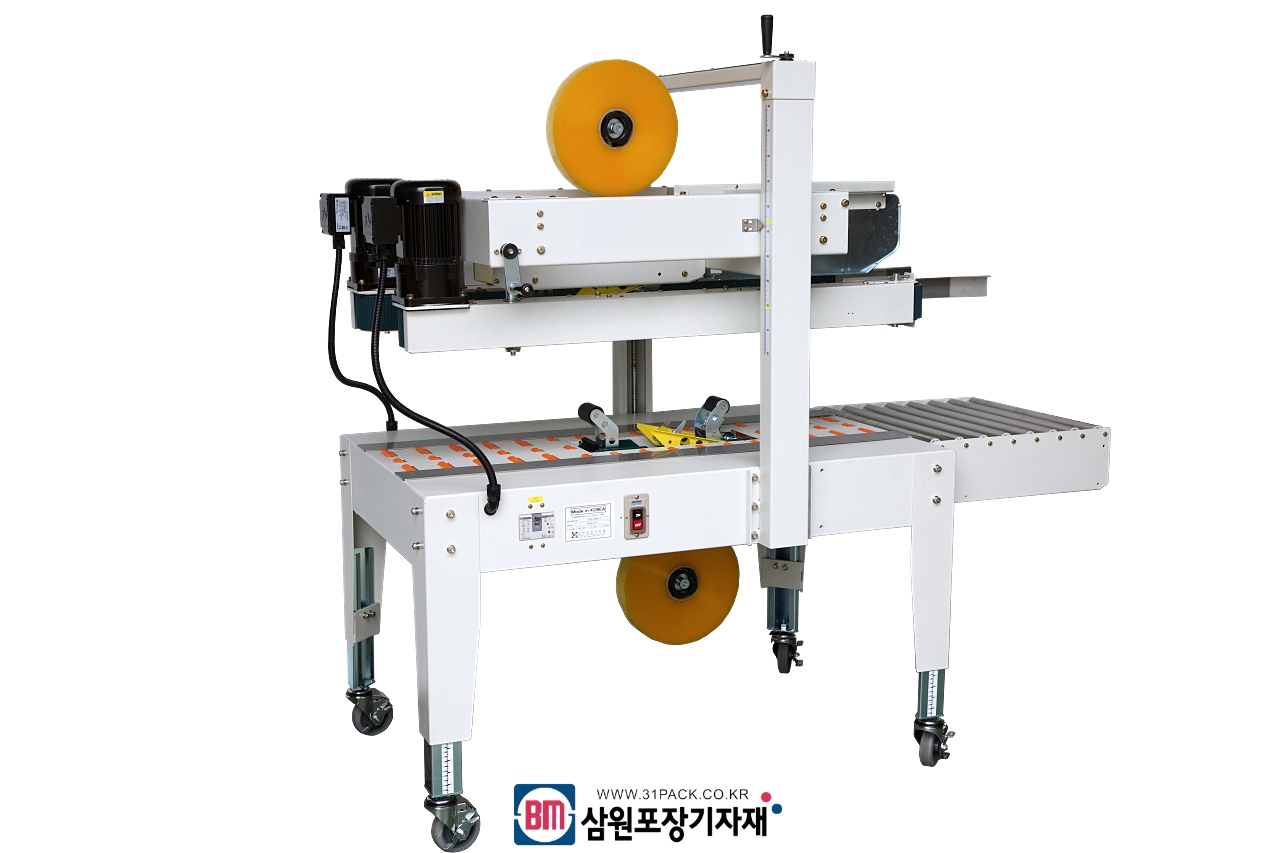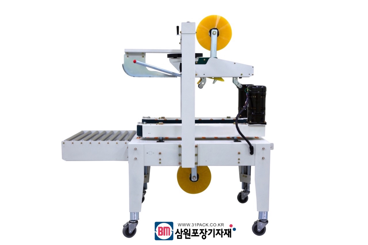 반자동 테이핑기 - 소형박스용 박스의 상부, 하부를 자동으로 테이핑하는, 반자동 테이핑기로 박스높이 90mm의 낮은 박스까지 테이핑이 가능한 박스포장기계입니다 쇼핑몰, 택배회사, 물류센터, 제조기업에서 효율적으로 사용가능한 박스 테이핑기로 박스의 상부, 사이드, 뒷면을 자동으로 접어주고 빠르고 부드럽게 테이핑후 배출합니다 박스 크기에 따라 핸들로 높이, 폭 조절이 가능하며 기계용테이프나 박스테이프를 손쉽게 교체해서 사용할수 있으며 진입부 배출구에 보조 컨베어가 기본 장착되어 ...