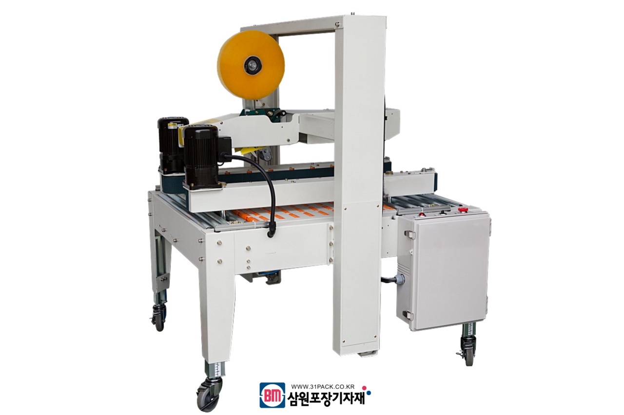 반자동 테이핑기, 박스포장기계 박스의 크기에 맞게 폭, 높이 조절이 가능한 반자동 테이핑기는 제품을 넣고 박스를 통과시키면 테이프 헤드에 의해 박스의 상하 동시 봉함후 배출하는 박스포장기계입니다 삼원포장의 테이핑기, 박스포장기계는 단순한 구조와 편하고 쉬운 조작으로 고장이 거의 없고 내구성이 뛰어나며 박스크기에 맞게 치수조절이 가능합니다 테이핑기에 제품을 올려놓고 작업할수 있는 보조 컨베이어를 진입부에 설치할수 있으며 테이핑기 배출구쪽에 자바라, 컨베이어등을 연결하시면 매우 효율...