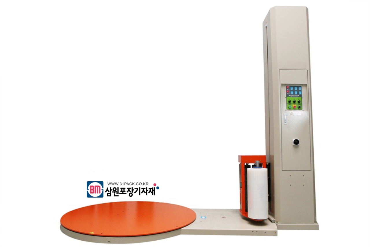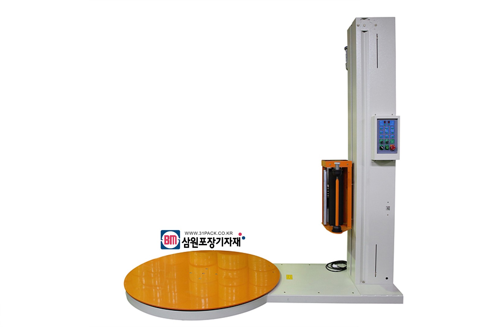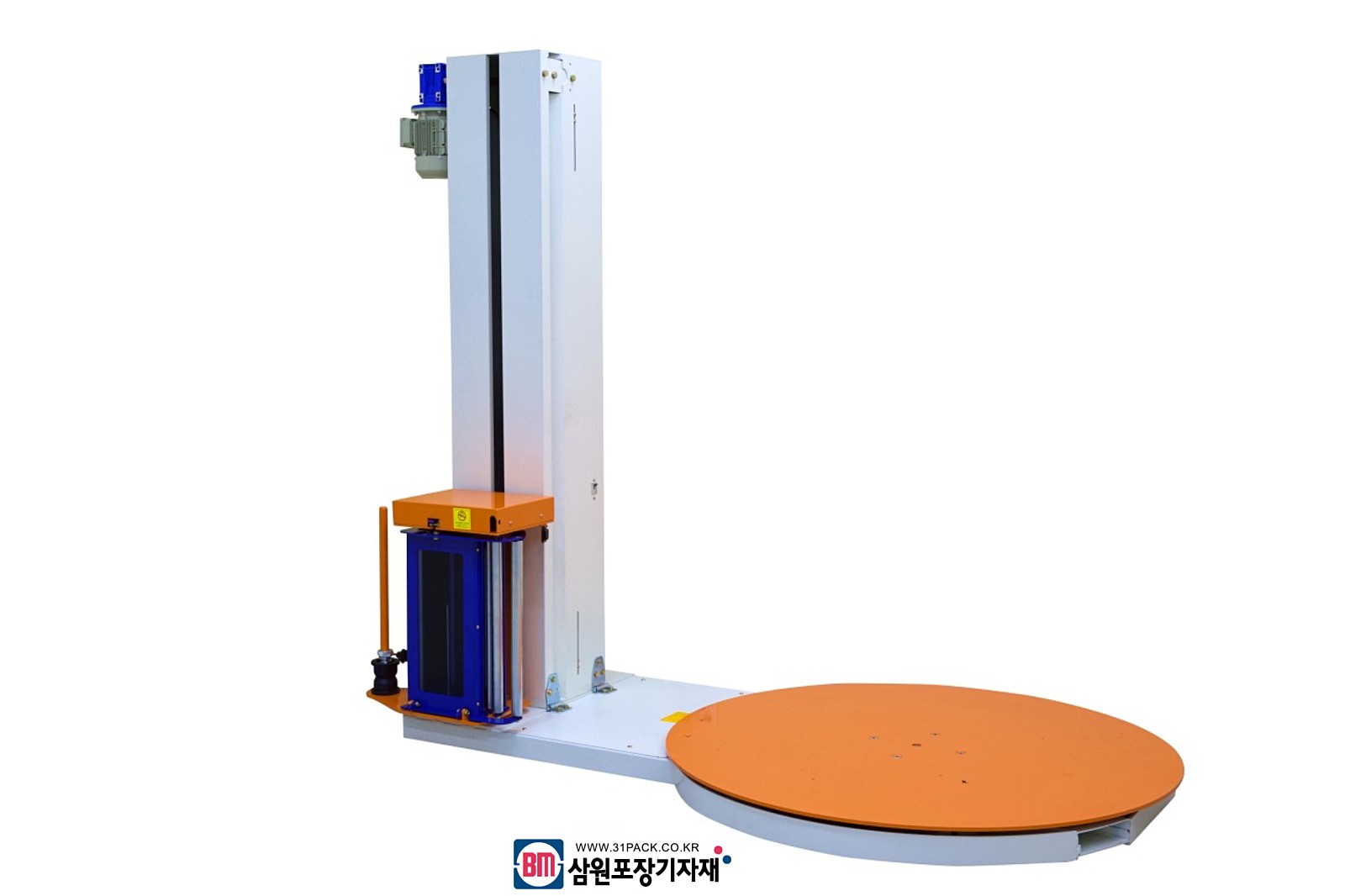 파렛트위 제품의 상,하 높이를 자동감지하여(센서장착) 원하는 횟수만큼 자동으로 랩핑해주는 파렛트랩핑기, 랩핑기는