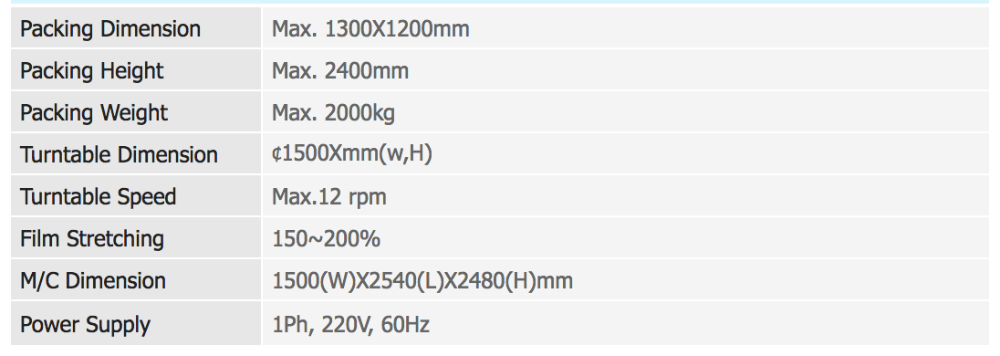 1500mm의 회전판, 포장중량 최대 2톤의 사양으로 턴테이블의 상승,하강속도를 조절 및 상하부 랩핑횟수 조절이 가능하며