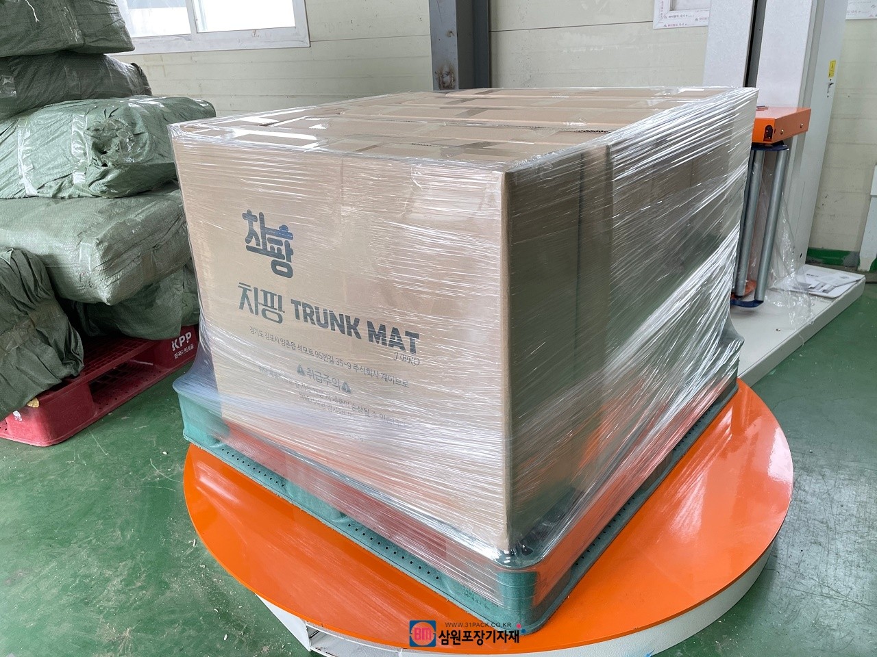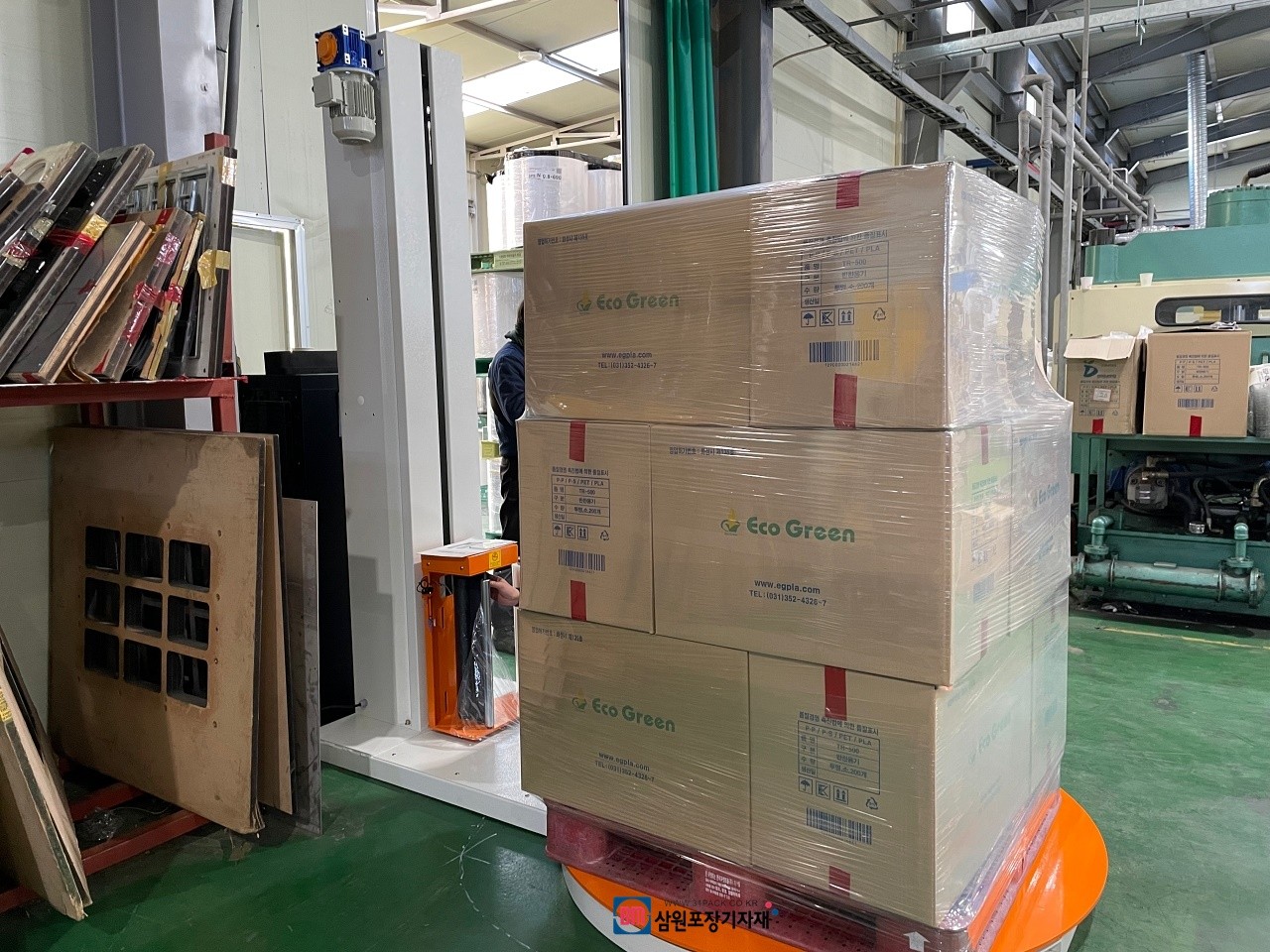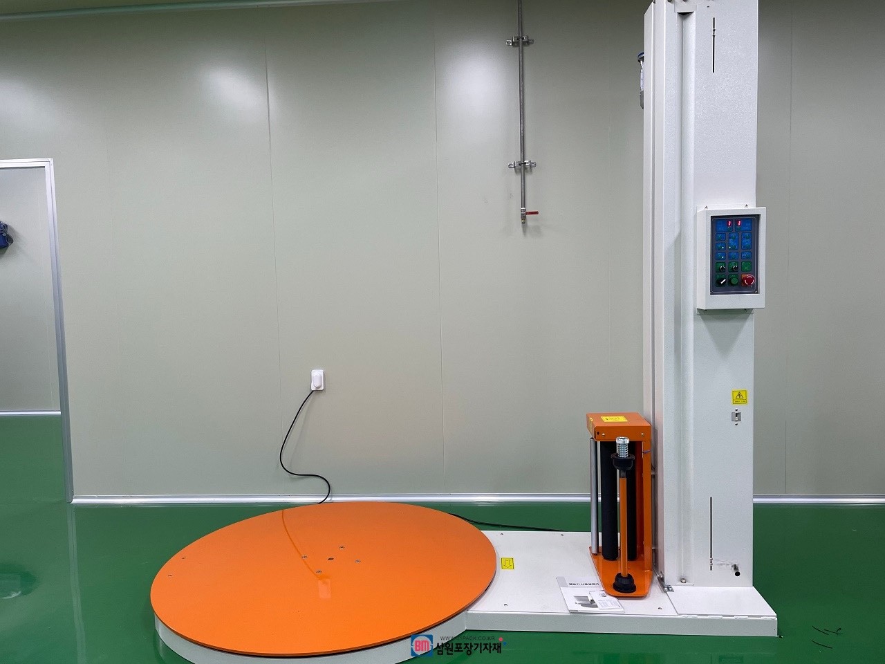 파렛트위 제품의 상,하 높이를 자동감지하여(센서장착) 원하는 횟수만큼 자동으로 랩핑해주는 파렛트랩핑기, 랩핑기...
