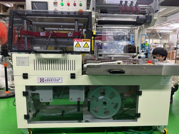 투명한 PE 롤필름을 수직 L실바(L-Sealing bar)로 실링해서 밀봉 비닐포장하는 기계로