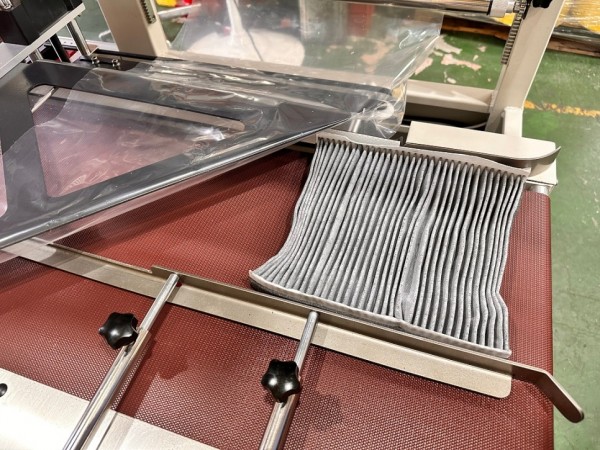 일반적으로 에어컨 필터와 같은 제품을 비닐포장할때는 공급컨베이어를 연결해 삼면포장하는 삼면포장기가 많이 사용되는데요