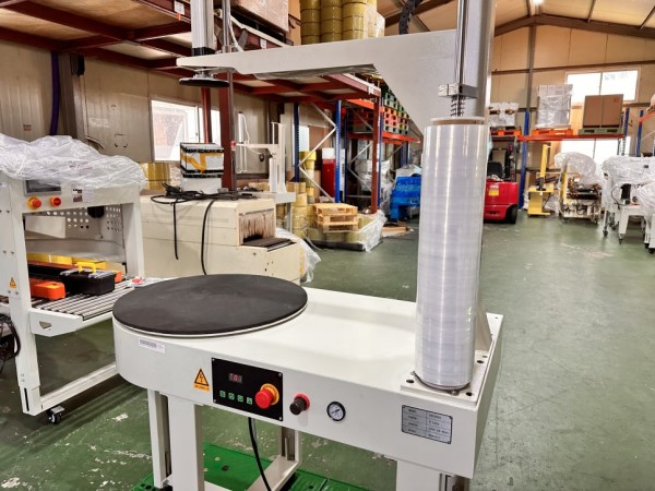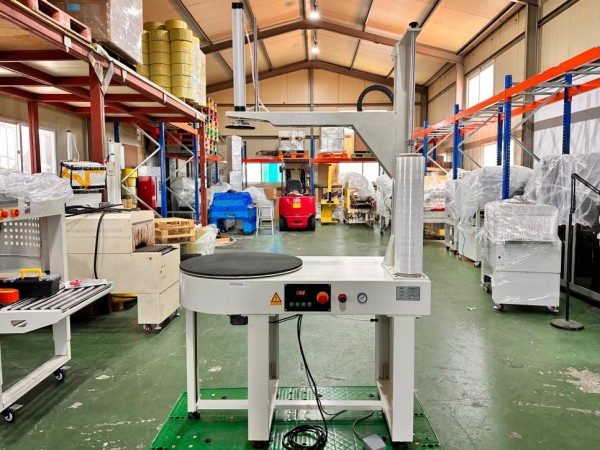 박스등을 올려놓으면 프레스가 박스를 고정하고, 턴테이블이 회전하면서 랩포장해주며, 작동은 버튼 및 풋스위치로 조절할수가 있습니다