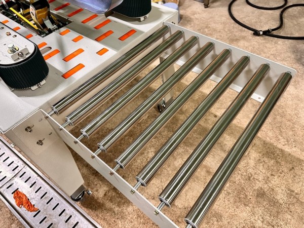 박스진입부에는 무구동 롤러가 달린 보조컨베어가 달려있어서 박스를 접어 제품을 넣기 좋습니다.