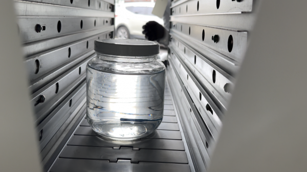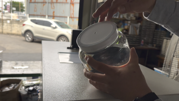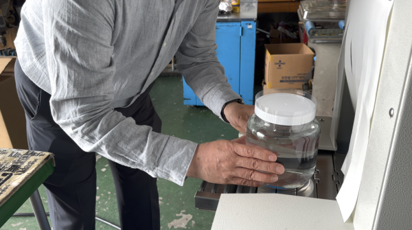 용기뚜껑 수축포장하는 탑체인터널, 탑체인수축터널 샘플테스트
