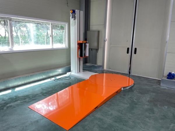 파렛트 위의 제품을 자동으로 랩포장하는 파렛트랩핑기, 랩핑기 와 경사판 셋트입니다.