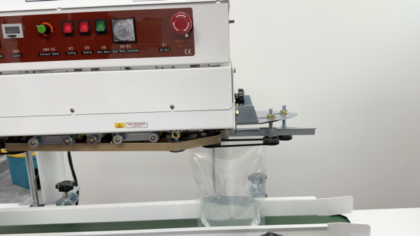 삼원포장기자재의 국산제작 수직형밴드실러는 파우치의 높이에 따라 컨베어, 헤드의 높낮이 조절이 간편하고