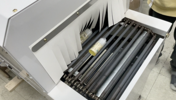 전자담배액상에 맞는 수축필름을 씌우고, 수축터널에 넣어주면 연속으로 수축포장작업이 진행되며