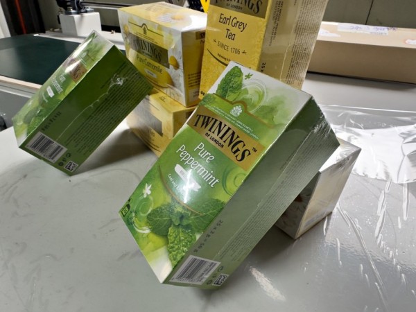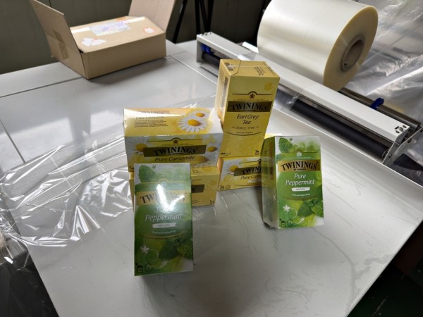 오늘은 얼그레이, 페퍼민트등 각종 티백을 담은 박스 비닐포장을 위해서 수축포장기 테스트 작업 요청이 있었습니다