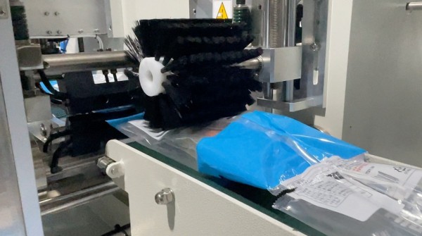 제품을 비닐로 삼면 실링을 해서 포장하는 자동포장기계로 연속으로 제품을 투입후 비닐포장할수 있어서