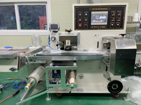 삼면기계 본체가 세트인 포장기계로 고속, 대량으로 비닐포장을 하는 자동포장기계입니다.