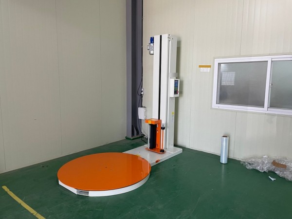 실내에 설치된 파레트랩핑기, 파렛트랩핑기입니다.