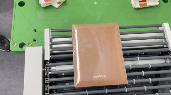 수축필름으로 실링된 책은 자동컨베어로 이동되며,