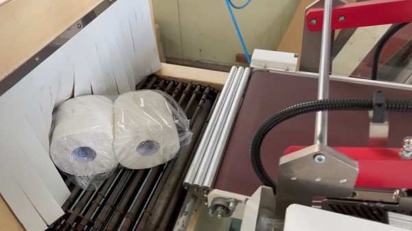 전자동수축포장기계 샘플테스트 문의로 보낸 화장지를 묶음 포장하고 있습니다.