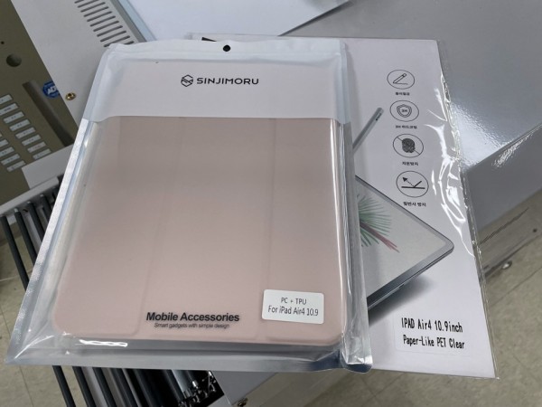 태블릿용 케이스와 강화유리를 수축포장으로 동시에 수축포장해