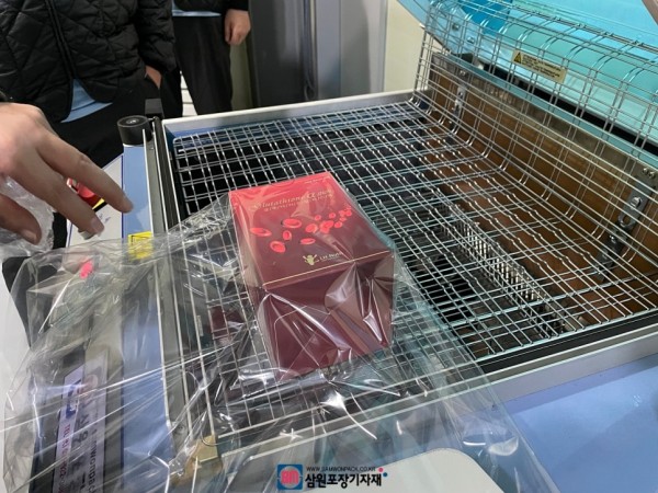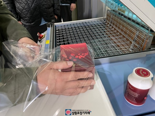 영양제가 들어 있는 박스를 수축포장하는 용도로 사용했으며 챔버형수축포장기는 수축필름사이에 제품을 넣고 이동, 챔버를 닫아주는 과정까지 작업자가 하면 나머지 수축과정이 자동으로 이뤄집니다