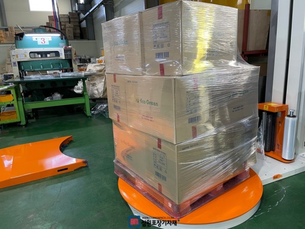 랩핑기는 파렛트 위의 제품을 자동으로 감지해 아래부터 위로 다시 아래로 랩핑하는 자동랩핑기로