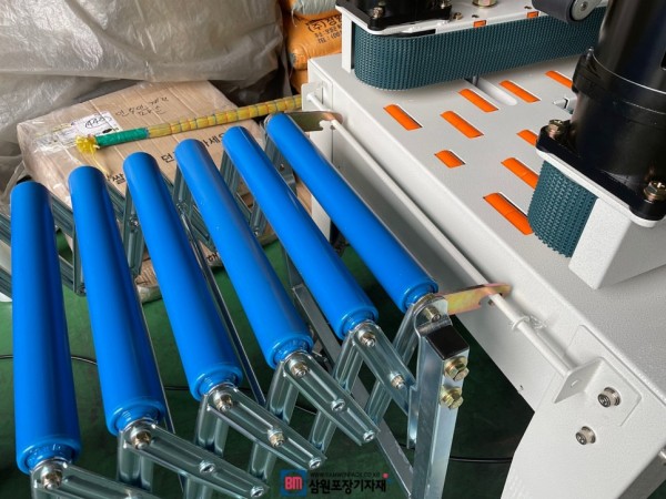 박스 투입구에는 무구동롤러가 달린 보조컨베어가 있어서 박스를 접어서 제품을 담을 수 있고