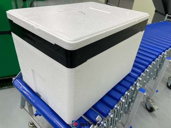 아이스박스의 2면이 테이핑된후, 아다치컨베어를 통해 이동한후