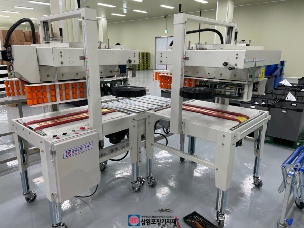 제품이 투입되면 센서가 박스의 진입을 감지해 작동을하게되고 박스의 양옆 2면을 사이드테이핑 한뒤, 아다치 컨베어가 밀어주면 나머지 2면도 테이핑하는 작동구조로 ㄱ자 또는 ㄴ자로 배치되게 됩니다