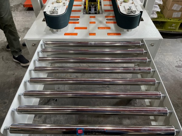 박스를 넣는 진입부에는 보조컨베어를 달아드려서, 제품을 담고 박스를 밀어넣기 좋게 하고 있습니다.