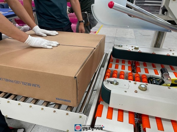 작업자가 모니터를 담은 박스를 밀어넣으면 사이드벨트로 앞으로 이동하면서 상, 하 테이프 헤드가 박스를 테이핑하고 배출하게 됩니다.