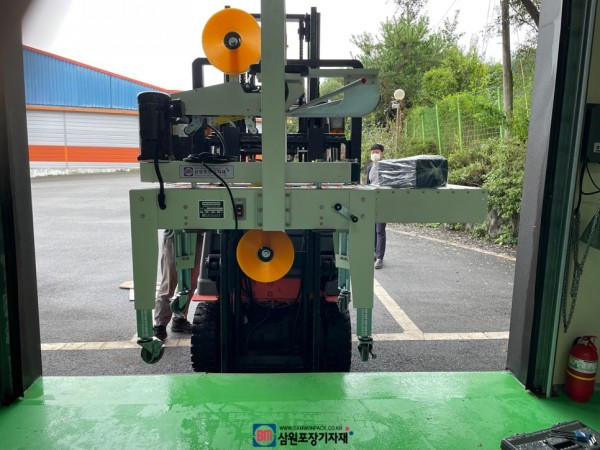 테이핑기를 내려서 작업현장에 지게차로 옮기는 중입니다.