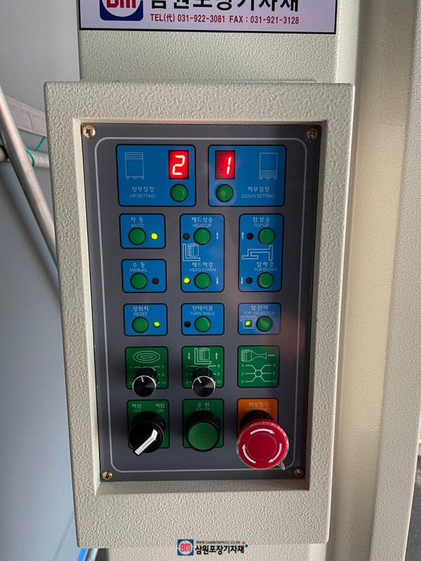 랩핑기의 PLC 컨트롤러는 상부감김횟수, 하부감김횟수를 0~9까지 설정해줄수 있으며, 제품을 자동감지해서 랩핑해주는 자동모드 또는 작업자가 직접 콘트롤하는 수동모드로 선택할수 있습니다.
