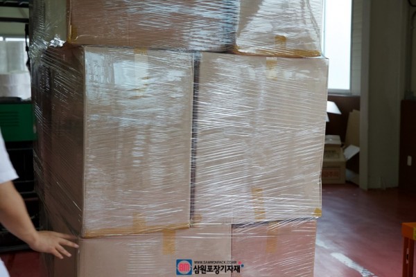2미터가 넘게 쌓은 여러개의 박스는 이렇게 랩핑기로 확실하게 랩포장하는게 중요합니다, 버튼한버난 누름면 자동으로 포장해주는 자동랩핑기로 업무효율을 높여보세요, 국산제작의 파렛트랩핑기는 일산 삼원포장기자재에서 직접 테스트해보고 구입가능합니다