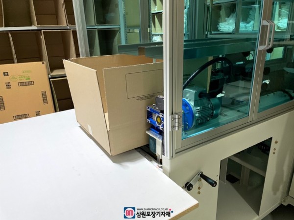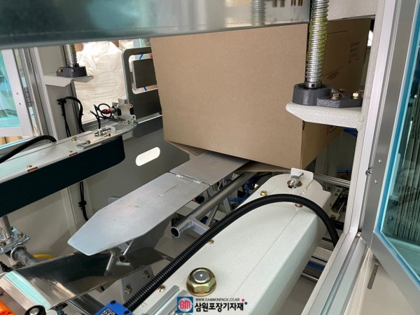 박스가 공급되는 메가진과 하부 제함 및 테이핑이되는 제함기가 ㄱ자 형태로 연결됩니다.