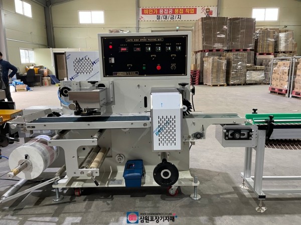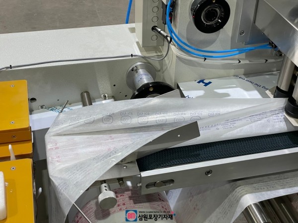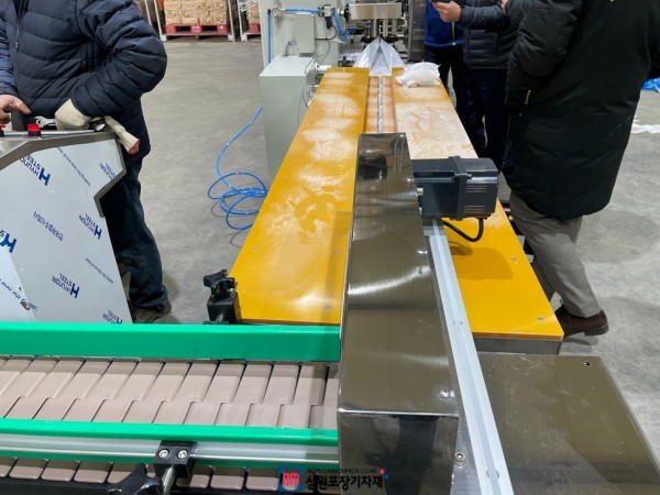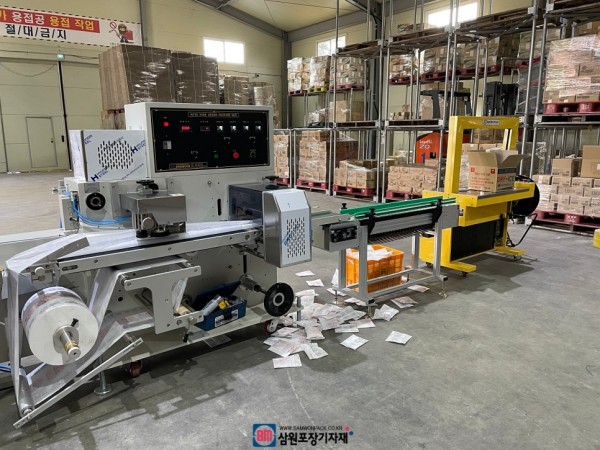 삼면포장기와 배출구에 자동컨베어, 자동밴딩기를 자동포장라인으로 연결했으며