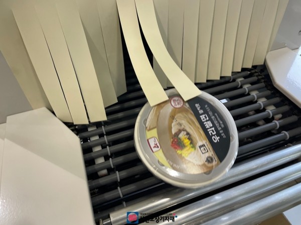 포장라인에 열전사프린터등을 연결하면 컵용기, 라면용기 하단에 제조일자, 유통기한등의 인쇄도 가능합니다.