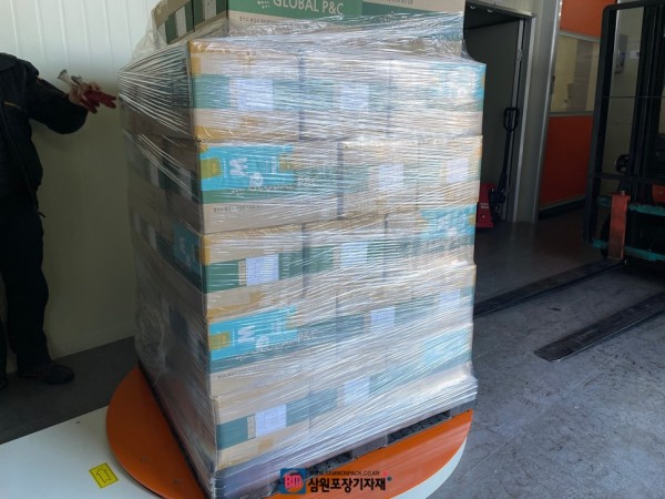 제품을 전체 감싸는 랩포장뿐아니라 하단의 파렛트와 제품을 고정하는 역할도 하기 때문에