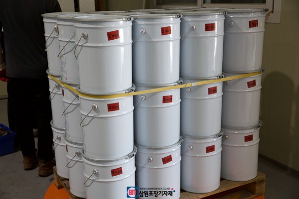 원료가 담긴 철제통으로 랩핑시 파렛트의 하단이 제품과 단단히 고정이 되고 상단까지 랩으로 잡아주길 원하셨습니다.