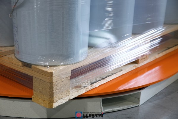 파렛트랩핑기는 600kg 정도의 중량으로 턴테이블 하단과 반대편까지 두군데에서 지게차 홈이 있어서