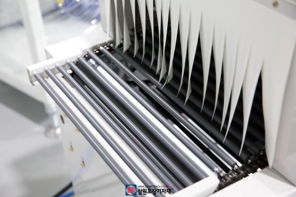 열수축으로 수축필름이 제품에 밀착된후 컨베어를 타고 배출되게 됩니다.