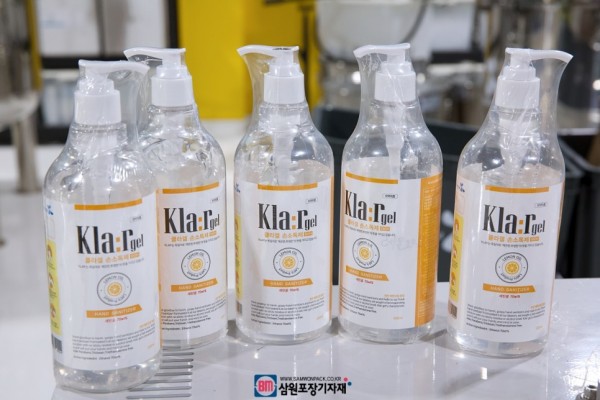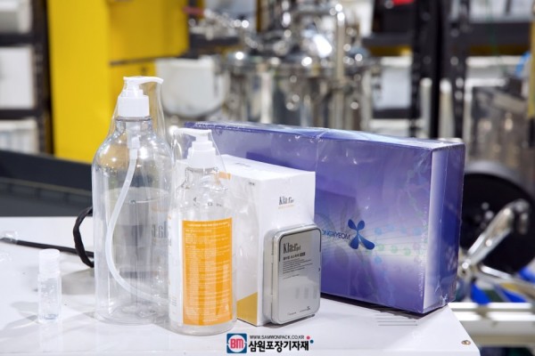 박스, 디스펜서용기, 일회용용기등에 담긴 손소독제를 자동수축포장기계로 포장후 출고할 예정입니다