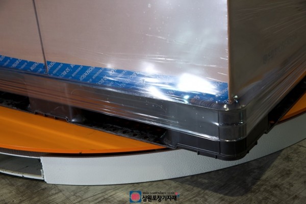 랩핑기의 가장 큰 장점중 하나인 파랫트와 제품을 함께 랩핑해주는 하단부분의 모습입니다.
