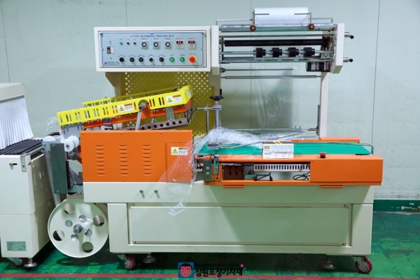자동엘실러와 자동수축포장기로 구성된 자동수축포장기는 여러크기의 제품을 연속적으로 수축포장할수 있으며