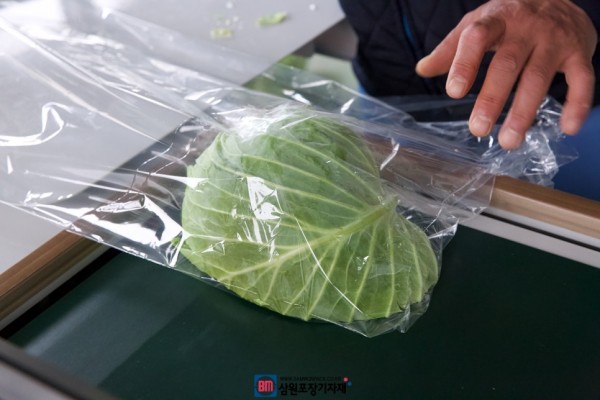 반자동수축포장기는 겹지로된 수축필름에 양배추를 넣고