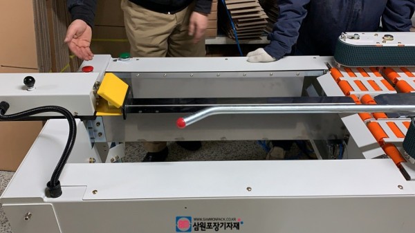 왼쪽은 박스의 하부를 접어주는 하부제함기고 푸쉬로 박스를 밀어주면 하부테이핑을 해주게 됩니다.