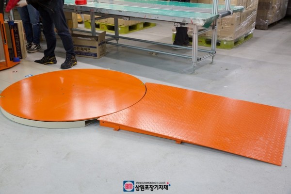 랩핑기의 회전판(턴테이블)에 연결하는 경사판은 핸드자키, 핸드리프를 사용할수 있도록 해주어